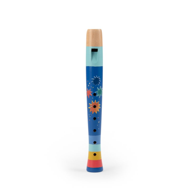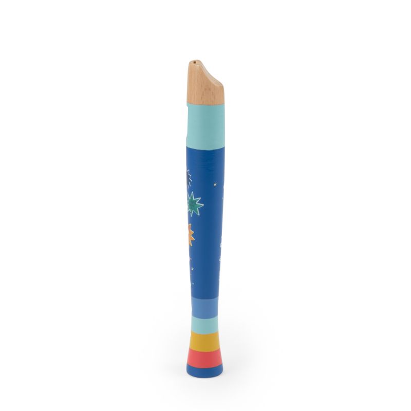 Flûte en bois à 6 trous, colorée de vert d'eau et violet, aux illustrations joyeuses et dansantes avec plumes et confettis dessinés. Elle aidera les tout-petits à développer le rythme et l'éveil musical, et s'adapte aux petites mains dès 2 ans.