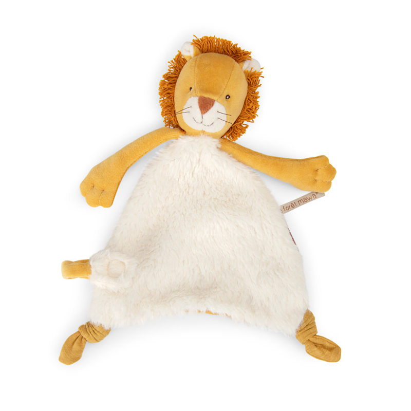 Doudou lion Mamba plat avec attache-tétine. Facile à attraper pour les petites mains, il deviendra vite un indispensable pour accompagner bébé dans toutes ses aventures et ses moments de tendresse.